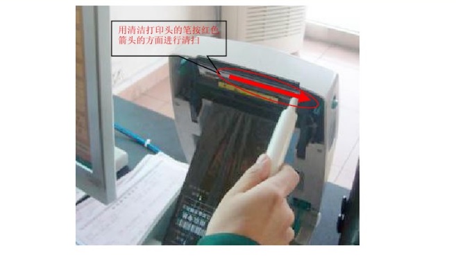 关闭打印机电源,先用棉签除尘,但注意不能用坚硬的毛刷清扫打印头表面,以免损坏打印头表面膜,接着使用专用清洁笔或浓度为75%的酒精或棉签清洁打印头,然后朝一个方向擦拭打印头发热线表面,清洁完成后需等酒精挥发再开机,如下图: