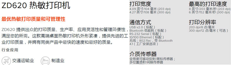 斑马ZD620凭借300dpi打印分辨率,您可以支持更多应用。高图像质量可支持小型二维标签或者需要图片(例如,徽标或图标)的标签。斑马ZD620条码打印机不仅拥有强悍的性能及酷炫的颜值,应用领域也是令人非常满意的,能够满足各类快递面单及发货单,也能打印珠宝标签、固定资产标签、吊牌、货架标签。